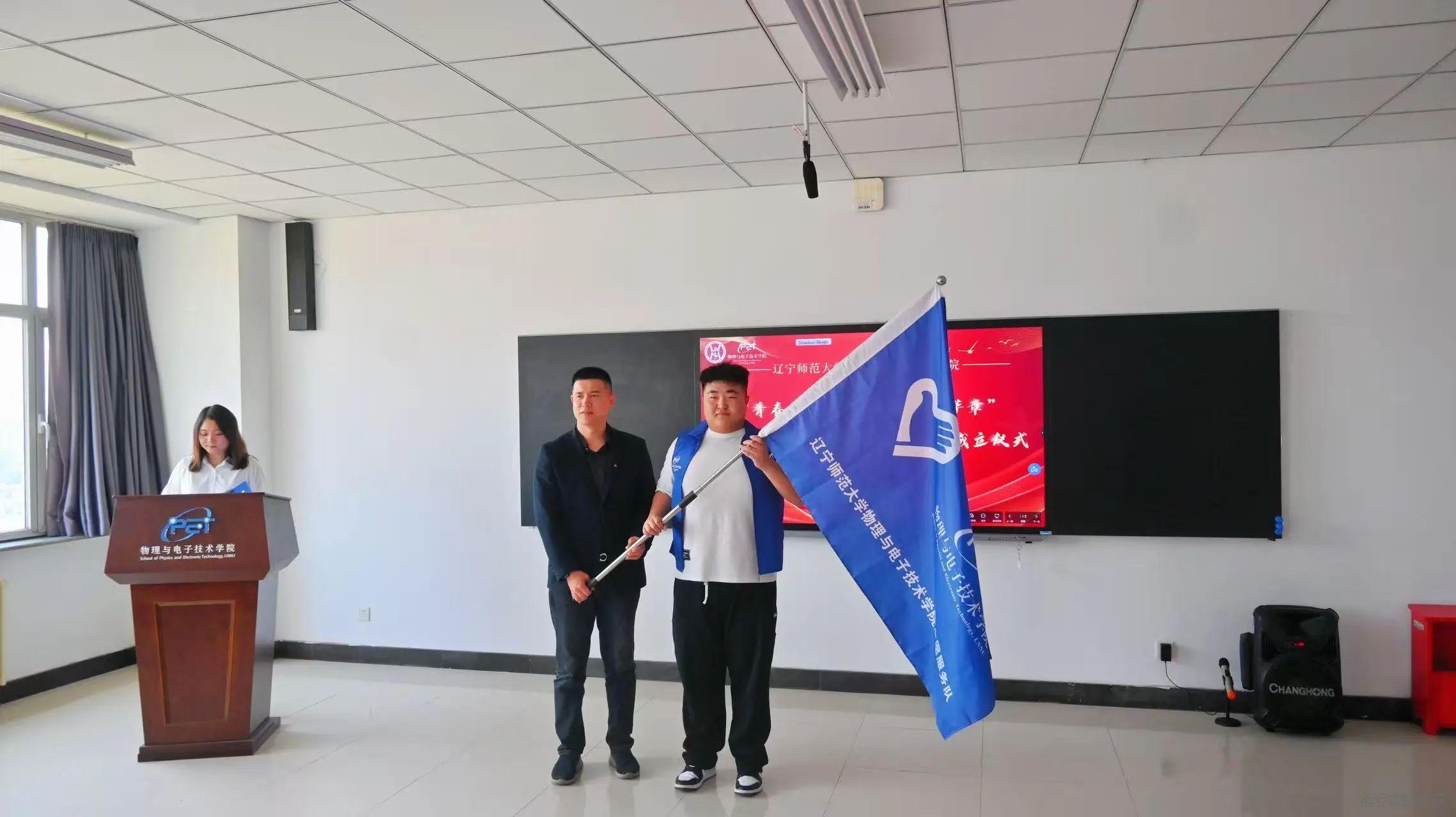 志愿服务将迈向专业化、常态化新台阶,激励着青年学子以实际行动诠释新时代青年的责任与担当,让青春在奉献中绽放绚丽之花。 孙强老师为志愿服务队授旗,并发表致辞,他表示志愿服务队的成立为同学们搭建了更广阔的平台,鼓励队员们勇担时代使命,积极投身社会实践。然后,志愿服务队队长杨东浩同学表态未来将携手队员们以饱满的热情投入志愿服务,践行五四精神与志愿精神。