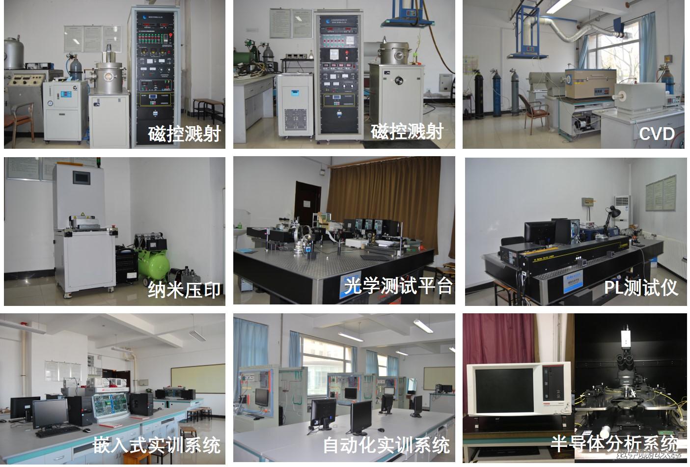 拥有大学物理、近代物理、固体物理、数字电路、模拟电路、半导体器件、材料物理、材料化学、光学工程、荧光光谱、PL光谱、微电子检测、光刻技术、光电技术、理论计算、传感器、节能技术、DSP、EDA、PLC、单片机、嵌入式、微机原理、数字电视、通信原理、电路分析、小型机器人系统设计、大学生创新实践、电路焊接、中学物理教学法、朗威教学、多媒体录播教室、计算机教室等65个教学及科研实验室,实验室实际使用面积约5600多平米。